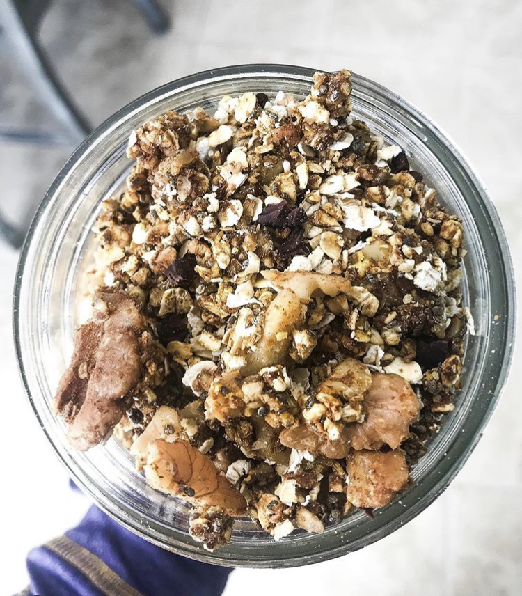 •2 1/2 cups of rolled oats, 1 cup of roughly chopped walnuts, 1/2 cup of chia and flax seed, 1/2 cup pumpkin purée, ALOT of cinnamon & pumpkin pie spice (to taste) , 1/3 cup honey or sweetener of choice, and cacao nibs (optional)